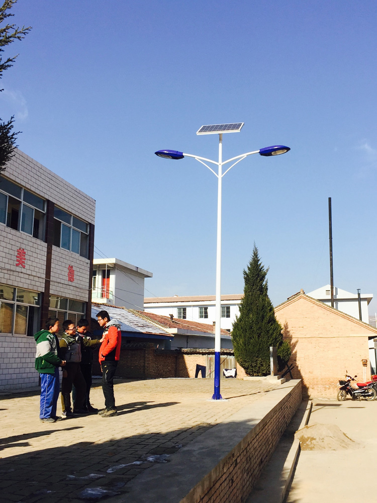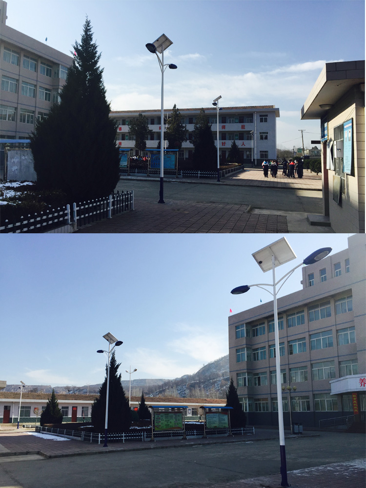 甘肅省平涼市學校路燈工程,采購的是我蘭光照明單板雙頭太陽能路燈,甘肅的冬季天黑的比較早,為了給校園操場提供照明路燈,安裝節能型的太陽能路燈,在學校的操場和道路上安裝,給同學們提供夜間照明。